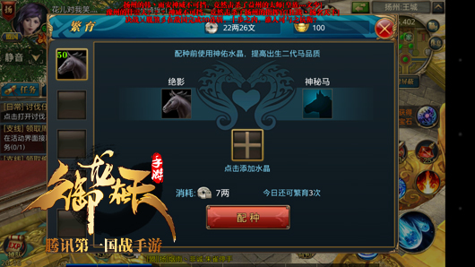 神佑水晶可以通过商城购买,当然成长礼当中也会赠送二级神佑水晶哦!在完全裸添加的情况下会有个别繁育出黄色以上品质的坐骑,但是几率并不大,所以想要获得好马还是需要添加神佑水晶。使用一级神佑水晶有机会获得黄色品质以上坐骑,二级神佑水晶有机会获得绿色品质以上坐骑。