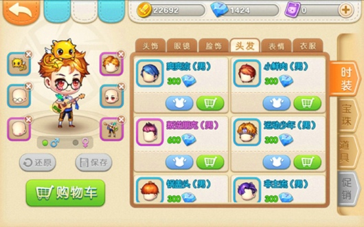 在注册时系统会让我们自由分配3件时装,分别为:头饰、表情和服装。除此之外,我们还可以在游戏商城中的时装栏目里购买更多炫酷的时装。如果你看上了某件装扮,只需点击该装扮下方的蓝色衣服按钮即可试穿,系统会自动为我们提供时装效果预览。搭配好全身的时装之后,点击人物下方的保存按钮即可将新增的时装加入购物车,去购物车付款之后就可以得到你心仪的时装。