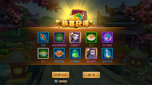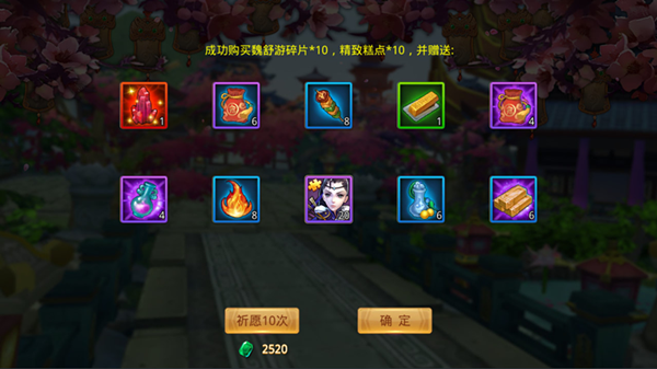 使用银币进行初级道具祈愿时,有几率获得绿色、蓝色、紫色品质的游戏道具,并且有几率获得武将的碎片。