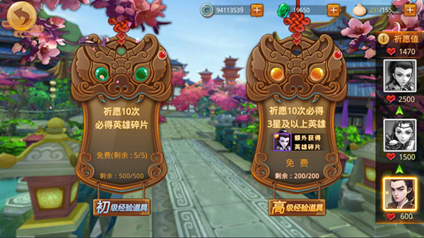 使用绿宝石进行高级道具祈愿,除了可以获得高级游戏道具和武将碎片,还有几率直接获得武将,而且每次使用10次祈愿,必定会获得至少一名武将。
