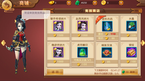 在商铺中也可以购买武将的碎片,在挑战界面的各项活动中获得的货币,可以在商铺中进行使用,来购买武将碎片或是游戏道具。