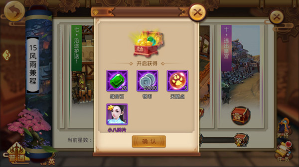 挑战普通副本时,只要达到指定的星数要求即可获得宝箱奖励,宝箱中可以开出武将碎片。
