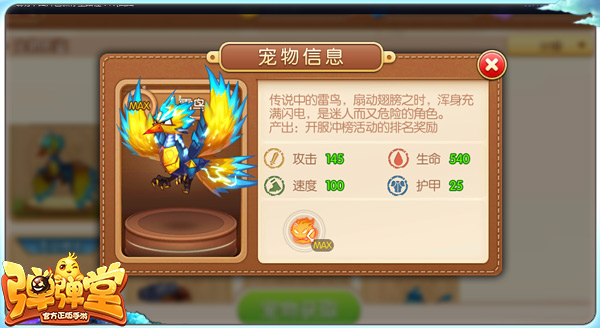 宠物分析:作为一款辅助选手必备的宠物,雷霆领主有着较高的生命加成。【治疗弹】可以为治疗对象一次性回复自身生命42%的生命,搭配高生命武器、生命加成宝珠等一起使用效果非常给力,有时可以将团队中的丝血输出直接奶至满血,是一位可以将你从鬼门关中拉回来的男人。