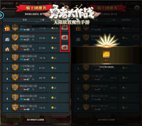 第三个金币彩蛋就躲在骑士团排名中。进入骑士团页面后,只需点击左上角的【骑士团排名】,全服骑士团排名跃然而出。在排名前三的玩家右侧均有一个拇指按钮。只需轻轻点击任意一个拇指按钮,就能获得88万金币,每日都能领取。虽然按钮有三个,但只给一次奖励呦~