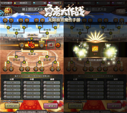 第二个金币彩蛋依然埋藏在骑士团中。点击下方中间的【比武大会】,就可看到比武大会的主要赛程。在冠军的旁边会有一个拇指按钮,点击直接送100万金币,是不是很爽。