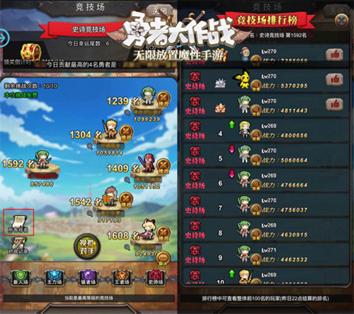 《勇者大作战》竞技场排名的金币彩蛋埋得也很深。在竞技场的左下方有一个【所有排名】的卷轴,点开后将能看到全服竞技场排行榜。和骑士团排名一样,在竞技场前三的右侧也会有拇指按钮,点击即刻送你20万金币。