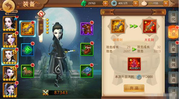 游戏中每个武将拥有6件装备,这6件装备都可以随着武将等级的提升而进行强化,从而使英雄获得更加强力的装备效果,比如最大生命的加成、攻击或防御的加成。