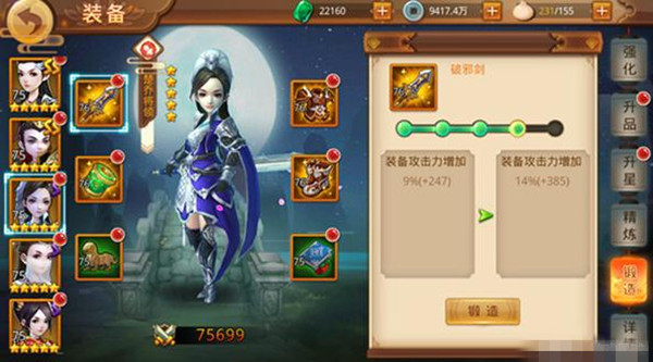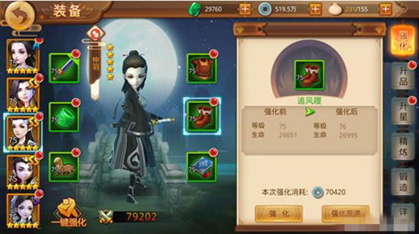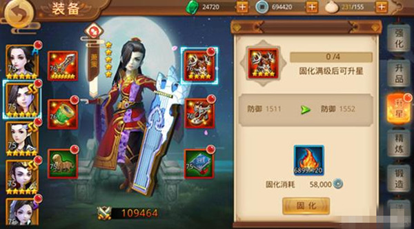 游戏中每一件装备自身拥有一套1—7级的星级系统,玩家可以通过消耗银币、三昧火精、升星石、红晶石对装备进行固化升星,从而大幅的提高装备的属性,装备升星的最大等级是7级,每升一级所消耗的物品会递增。