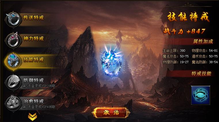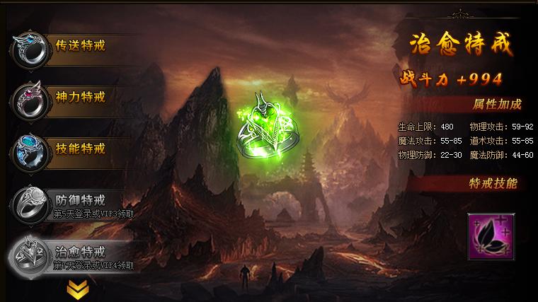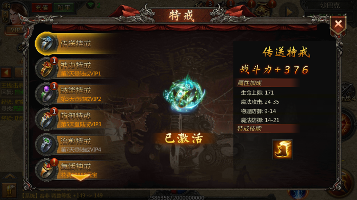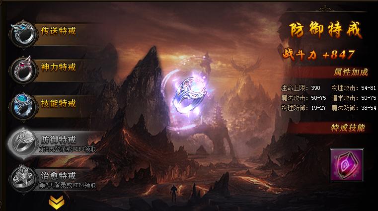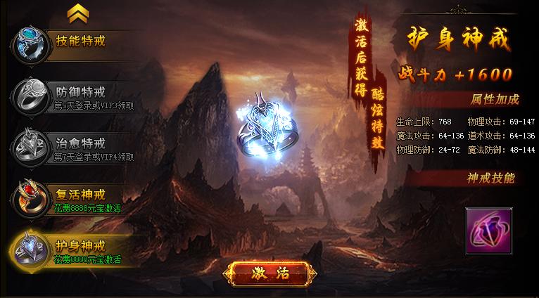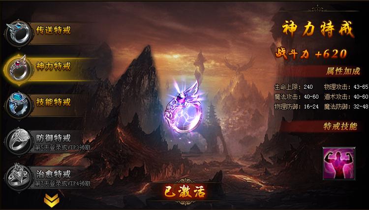 传送、神力、技能、防御、治愈特戒通过连续登录(或VIP直接激活)获得。
