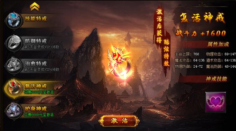 复活、护身(阴阳、麻痹)神戒需要消耗元宝激活。