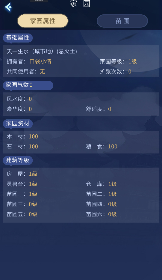 2.点击家园属性可以查看家园当前的属性、气数、资材、建筑等级等。