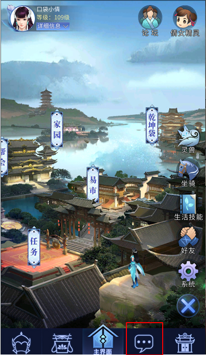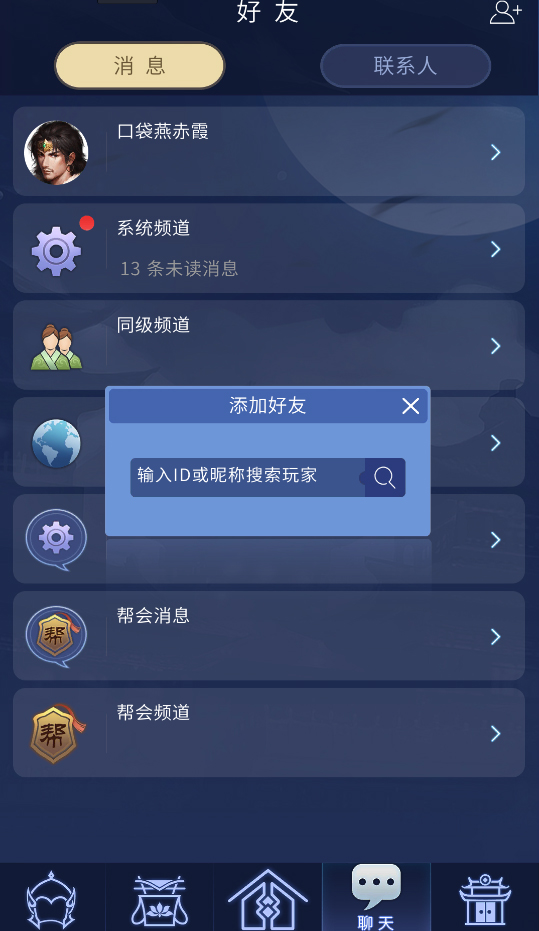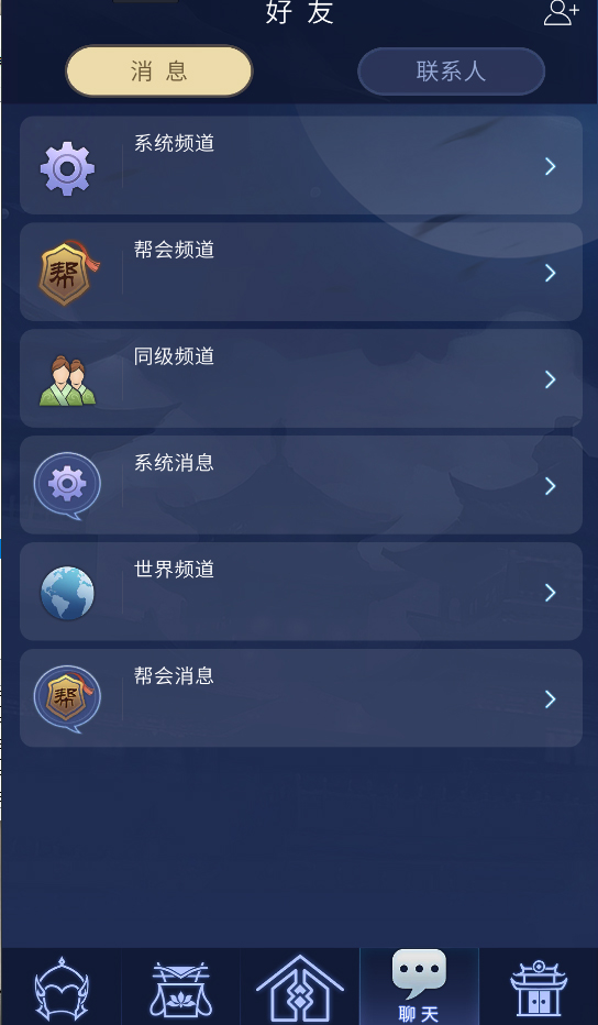2.消息界面分为频道消息(包括:世界频道、同级频道、帮会频道)和个人消息、系统消息以及帮会消息。