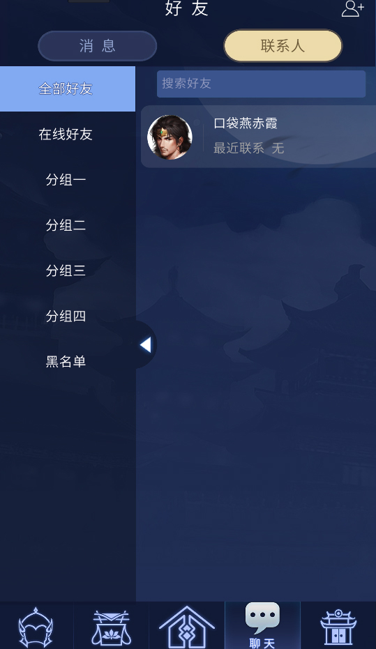 4.点击消息界面的联系人可以查看自己的好友,拖动界面左端的呼出按钮可以查看好友分组,更有在线好友分组可以快速找到在线的好友聊天。