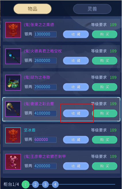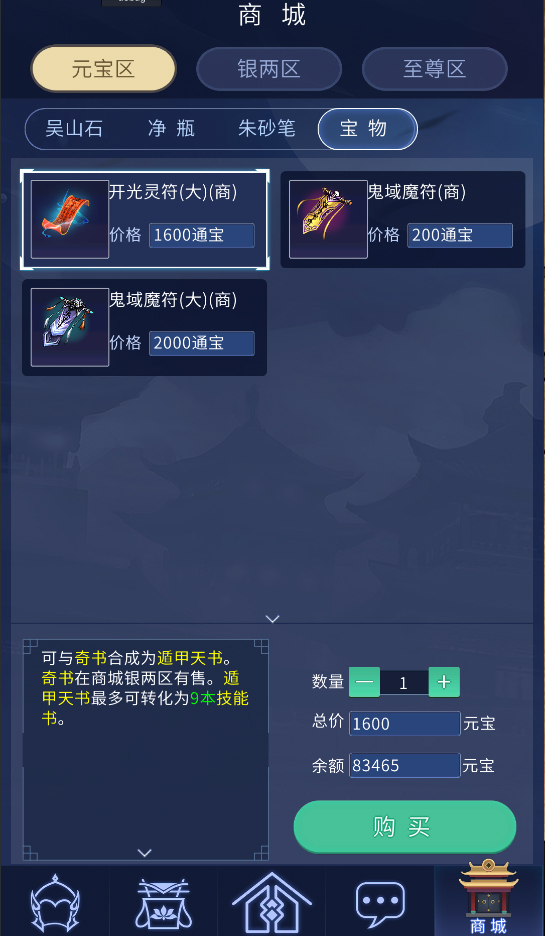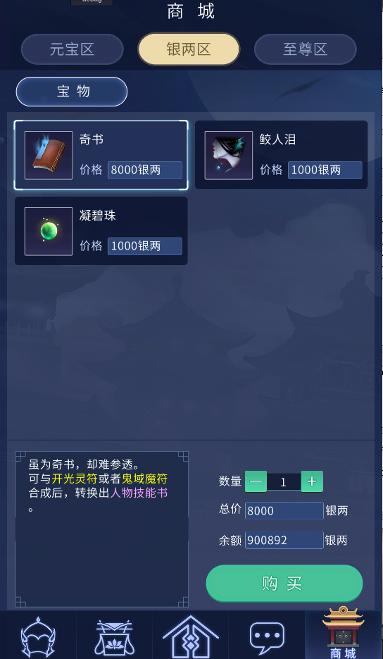 3.商城银两区目前上架:奇书、鲛人泪、凝碧珠。