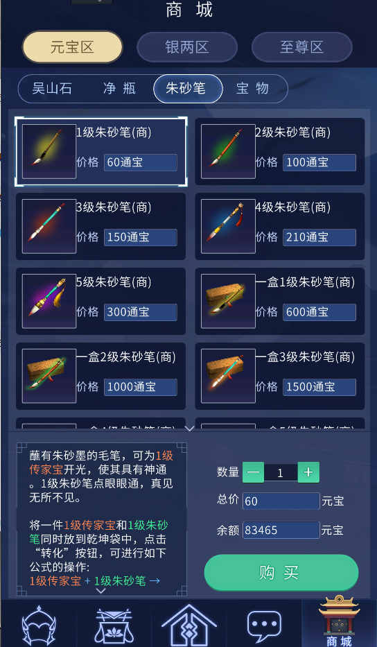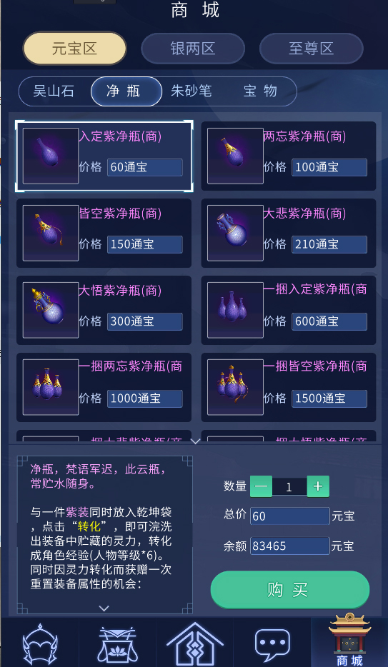 2.目前商城提供元宝区、银两区、至尊区三块,玩家可以在口袋版商城元宝区购买吴山石、净瓶、朱砂笔、宝物等物品,更多物品将在后期开放敬请期待。