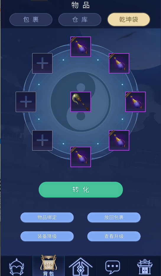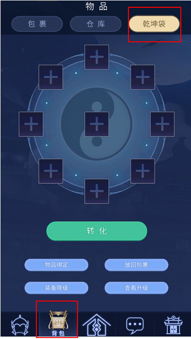 1.口袋版支持乾坤袋功能,可以在口袋版上进行装备的洗炼、升级以及传家宝的洗炼,点击主界面的乾坤袋按钮或者点击包裹中的乾坤袋选项进入乾坤袋界面。