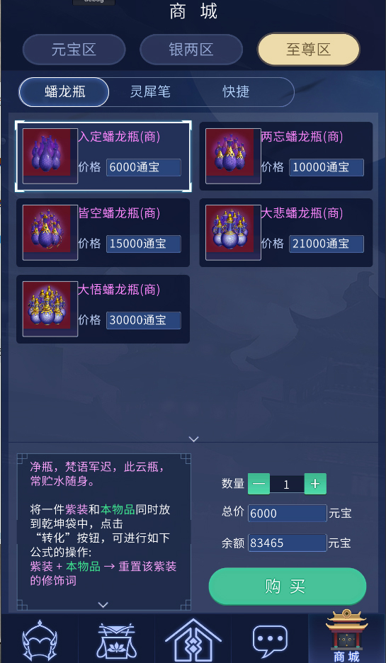 4.商城至尊区目前上架:蟠龙瓶、灵犀笔以及快捷使用的高级吴山石原石。