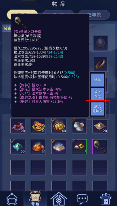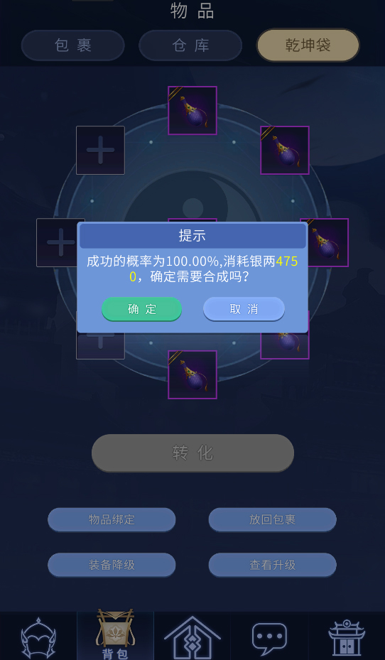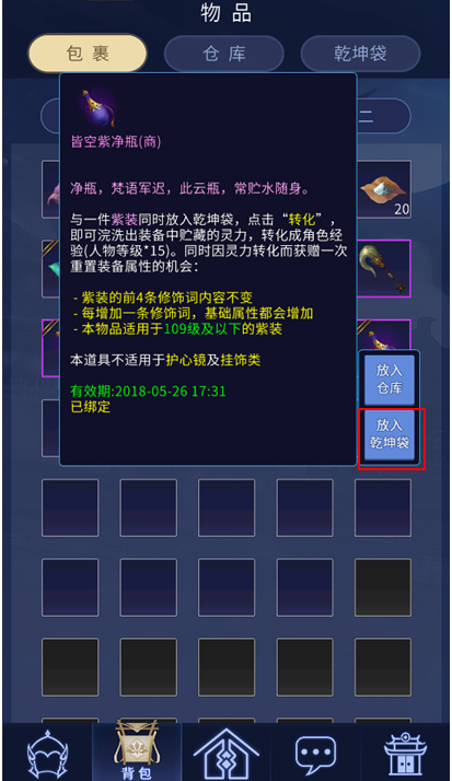 2.乾坤袋的使用方法与端游一致,首先将装备(在身上已装备的物品需要先卸下放入包裹)或者传家宝放入乾坤袋,再放入净瓶等道具,即可点击转化按钮进行洗炼。