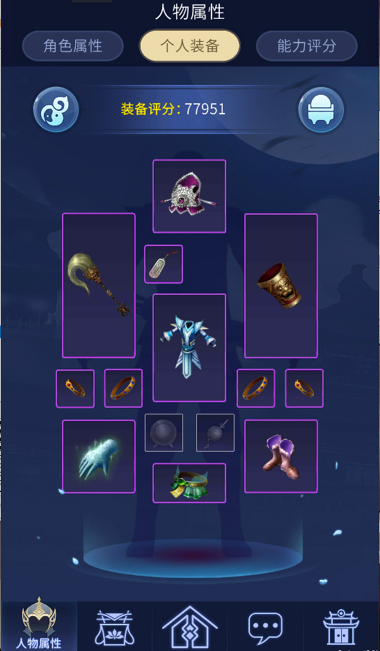 2.在人物属性界面可以查看角色属性、个人装备以及能力评分。