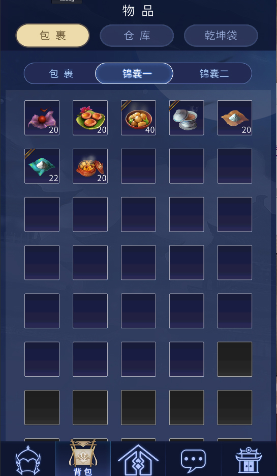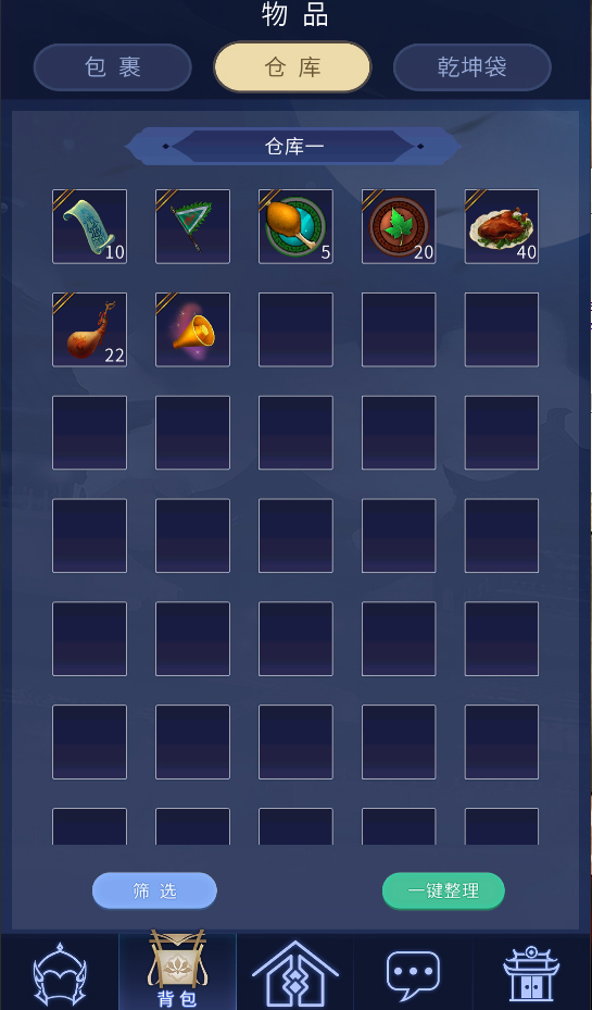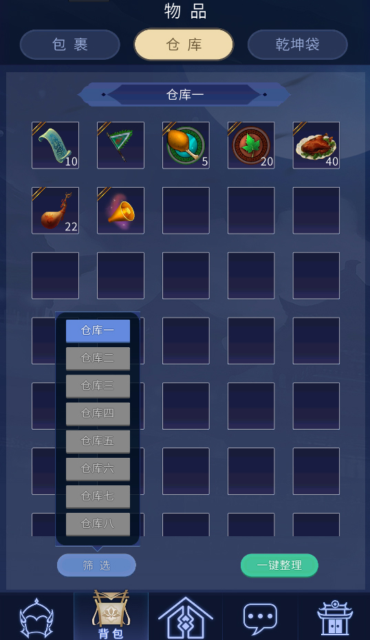 4.在主界面点击下方的包裹按钮,可以进入包裹界面可以查看包裹、仓库以及乾坤袋,点击仓库的筛选按钮可以选择查看第几个仓库界面。