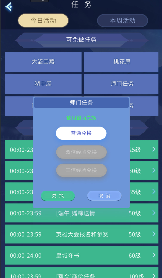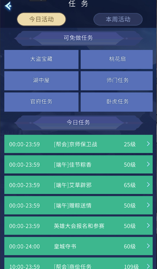 7.口袋版提供日常任务查看和免做功能,再也不用担心因为无法上端游而错过日常任务了,点击主界面的任务图标进入任务界面。可以查看今日活动和本周活动,并提供部分免做功能,有一定的等级修为限制。