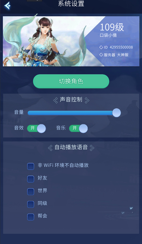 8.可以在主界面呼出的按钮中进行系统设置,包括切换角色、声音控制和是否自动播放语音消息。