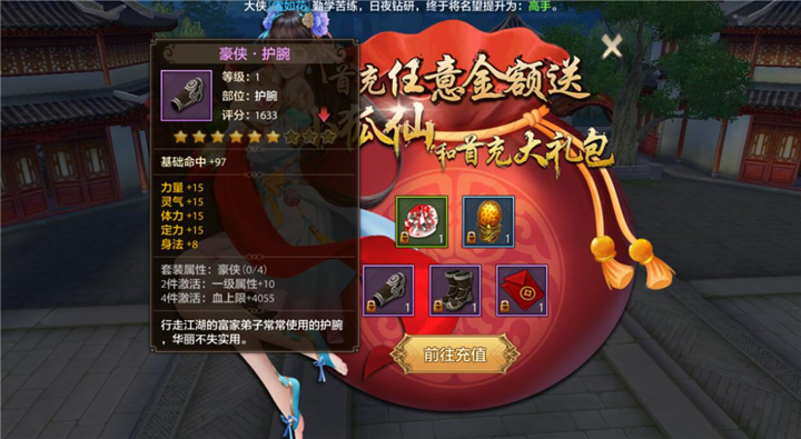 套装无疑是游戏前期非常好的装备,其中首冲礼包中的豪侠套装,对于天龙门派来说非常的适合,可以使用很久。