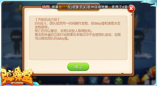 【齐射模式】是《弹弹堂手游》最新上线的【5V5】弹射对战玩法。在这里,玩家最多可以组成“5人小分队”,共同挑战对手赢得最终比赛!与以往的对战模式不同,【齐射模式】下团队所有成员将同时操作发炮,待所有成员操作完毕后系统将根据【delay值】和【速度】决定团队成员出手顺序。一方团队获得【5次击杀】后将赢得比赛,系统将结算比赛奖励和相关战斗数据。