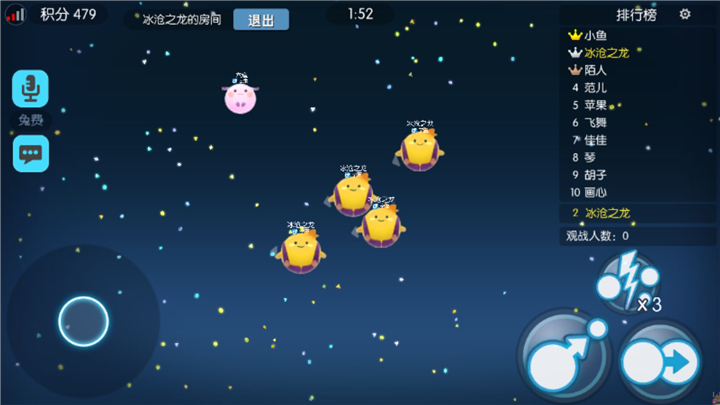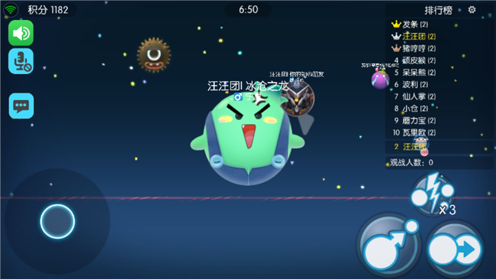 如果体积足够,但是遇到了比自己大的球球,那时就可以使用闪电技能将对方分成两半,甚至更多。闪电技能可以将对方强制分裂;如果将自己分成两个球体,甚至可以一次性将对方分成四个小球球,在这里值得注意的是对方最多被分裂为16个小球就不能再分裂了,如果对方已经被分裂了,并且体积远小于球球,那么不用客气,开心的扑上去把它们吃掉吧!