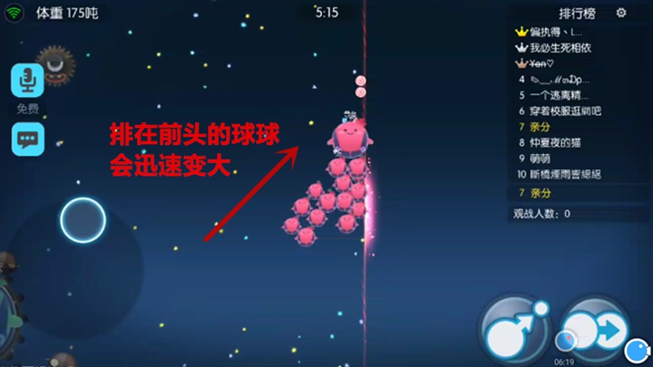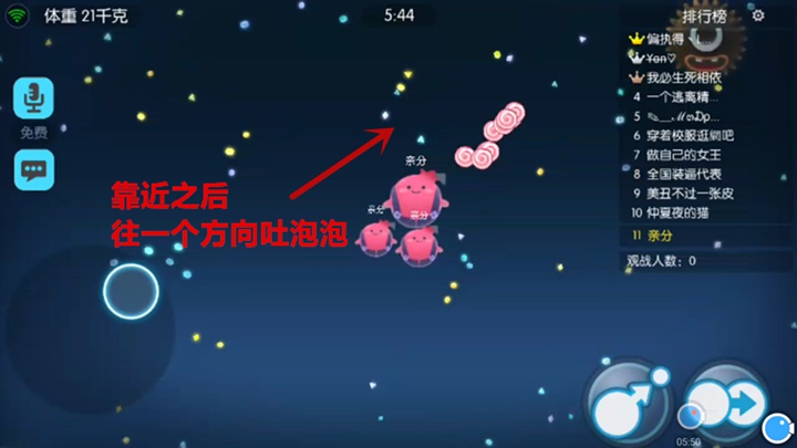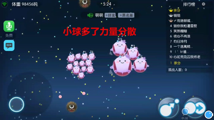 当我们吞吃了刺球,或者分裂了很多次之后,我们就有了一大群小球,这个时候必须快速合球才能保证不被大球吞噬,所以所有球球朝着同一方向移动,同时吐泡泡就是非常快速的合球方法了。