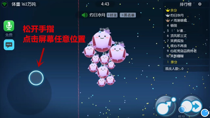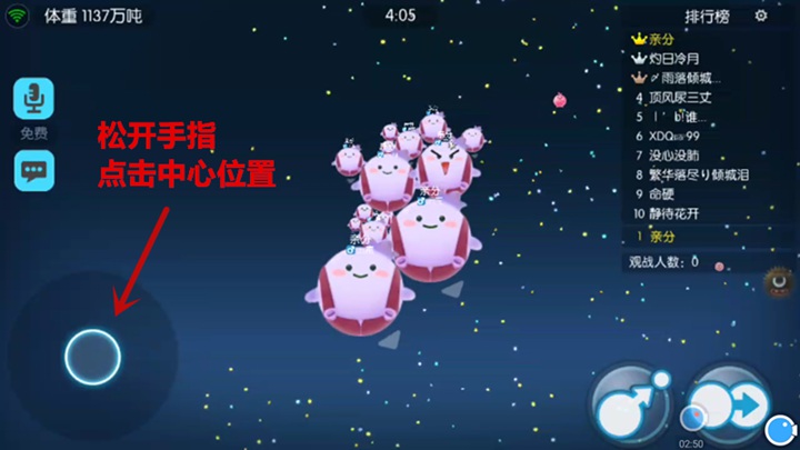 除了上述方法,我们还有另外的控制所有小球朝着中心吐泡泡的方法。我们可以看到控制球球移动方向的图标中心处有一个圆形按键,我们只要松开手指然后再点击一下圆形的中心位置,所有球球就可以朝着中心位置吐泡泡了。但是中心合球法也有缺点,就是经常无法完全集中球球的力量,吐出的泡泡会被几个球球分摊吃掉,从而造就的不是一个大球,而是2-3个大球带着一群小球。