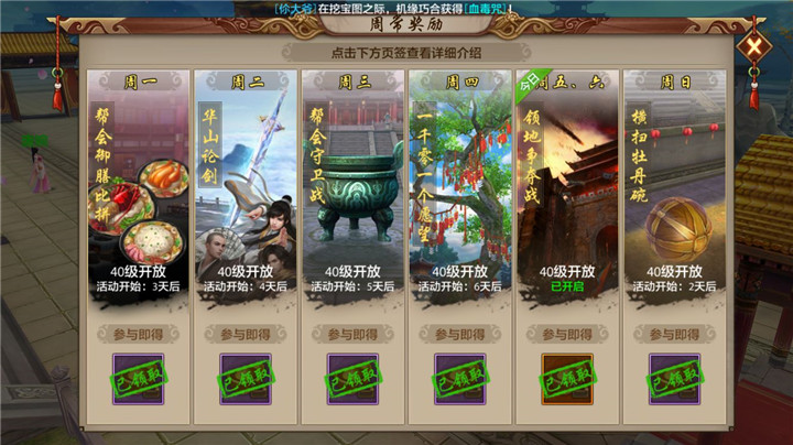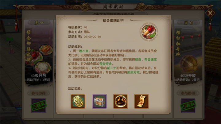 中华御膳活动登场将取代原每周一的帮会杀星,排行榜上的杀星榜同样变更为御膳榜。