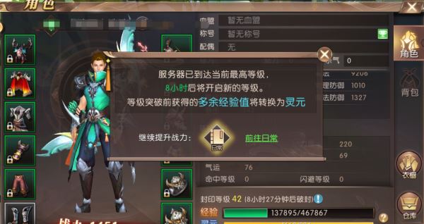 知道了等级封印,也知道了封印之中并没有给我们带来什么损失下面就让我们了解一下等级封印之后等级突破的时间,在角色面板右下侧等级封印的详细页面中就可以查看当前等级封印在什么阶段了,还有多少时间可以等级突破都有详细介绍呢!还可以查看经验值以及自己灵元数量。