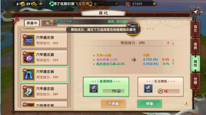 普通精炼需要花费他山之石与银币,而高级精炼则需要消耗他山之石以及一些玄玉,在点击精炼后若是属性不够理想则可以选择不保留,反之选择保留即可留住你想要的属性。并且每次精炼可不是都在提升属性哦,通过精炼使属性减少的例子也是很经常见到的。不过若是洗出单属性满的属性,无论其他属性有多低都推荐选择保留,因为一个满的属性,就会让你这个属性完全固定在这件装备上,非常的划算。