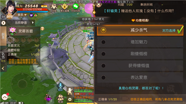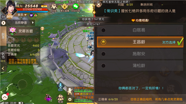 每答对一题都可以获得相应的经验和灵元奖励,同时还有概率激活普通莲花和极品莲花,激活一朵普通莲花,每个人可以获得1朵玫瑰,激活一朵极品莲花,每个人可以获得3朵玫瑰,这个是随机的。如果2个人20题都回答正确的话就可以获得“灵犀相通”的称号,但是这个称号只有一天,喜欢的轩辕勇士要争取经常答对咯