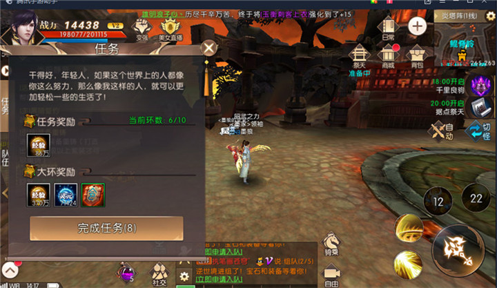 师门任务大概分为两类,一是对话任务,比如前往轩辕城,与边晋交谈,对话贾海瑞等等这些对应NPC交流,基本都在轩辕城,但也有在其他地图的;二是击杀任务,例如击杀青木城守护兽,击败马曹荣等,这类任务五千战力以上做起来,不费吹灰之力。完成起来可以点击任务列表的自动寻路,找到任务所需的NPC谈话,或者找到需要击杀的怪物。每一大环分为十次小任务,寻路完成即可非常简单,如果你实在有事,直接挂机,十五秒自动选择下一任务,一会再回来可能就自动完成了。