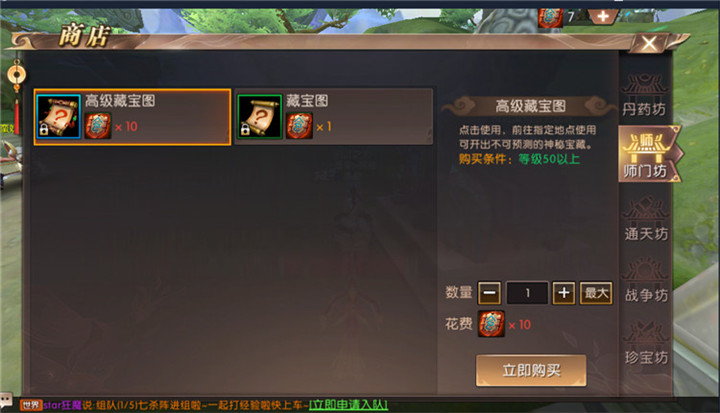 完成两大环可以获得两张师门令牌,但是不要换了普通的藏宝图,每五天可以换一个高级藏宝图,高级藏宝图可能开出金骷髅,为了避免金骷髅被抢,建议勇士们组队前往。