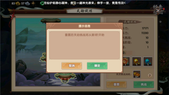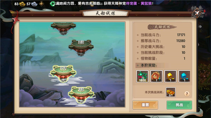 天劫试炼会在界面上显示你最高挑战到多少层,你现在处于多少层,本层是否开启,本层的怪物数量以及本层挑战的推荐战力,当然战力只供参考,很多仙友在战力远远落后于推荐战力时依然可以挑战过天劫试炼,这就要靠仙友们不断地摸索,不断的尝试打法,控制链以及走位的配合了,当然有高爆发和保命技能的职业会更占优势一些,控制链强劲的仙友也会非常舒服,但是像天君这样战斗能力一般的职业再打天劫试炼的时候就会因为输出不够的关系,稍稍落后于其他职业,不过这也无伤大雅,毕竟这只是活动玩法的一部分,我们可以通过其他的活动来获取道具奖励。也可以点击重置按钮,向下重置10层,重新挑战,来获得天赋经验的奖励。