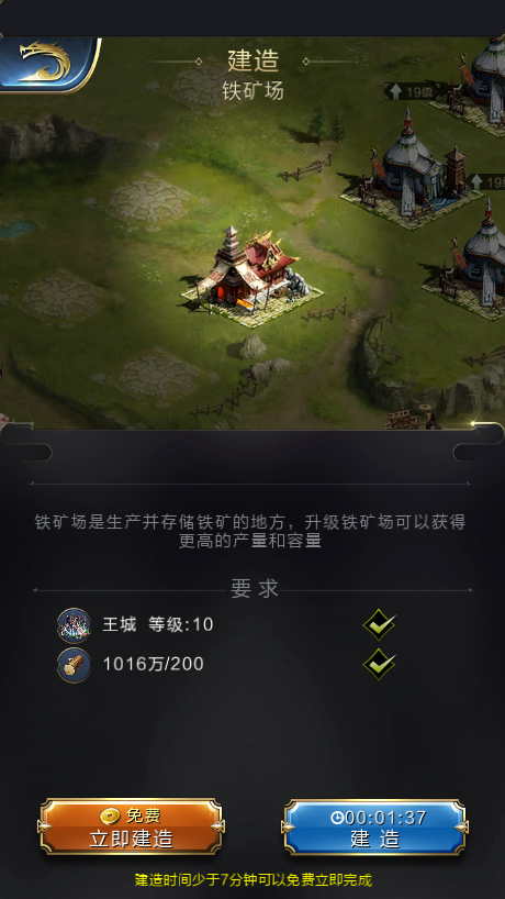 建造铁矿场需要王城等级10、木材200和空地一块,满足这三个条件即可建造成功。
