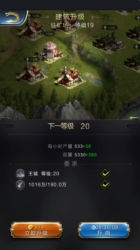 首先点击想要升级的铁矿场,会弹出三个按钮,依次是“详情”、“升级”、“金币增产”。点击“升级”按钮,系统会弹出“建筑升级”界面,界面中会提示王城等级限制、升级铁矿场需要消耗的粮草数量和现有粮草数量,如果以上两个条件均满足升级要求便可以点击升级按钮。
