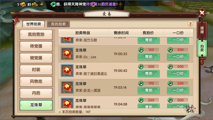 龙珠草。小捆龙珠草、大捆龙珠草加入拍卖行,可以进行拍卖。