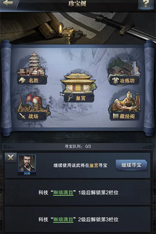 主公只需派遣魅力值≥70的武将前往珍宝阁中的皇宫、战场、名胜、藏经阁、冶炼坊这五个寻宝点寻得功能各异的宝物,在其中所寻得的宝物便会置入物品栏中,并将赐予武将,使其获得属性和技能加成,从而获得战力的极大提升。