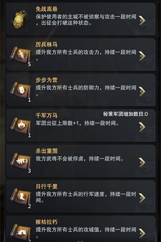 千军万马秘策可使我方军团出征上限数+1;使用杀出重围秘策可使我方武将不会被俘虏;