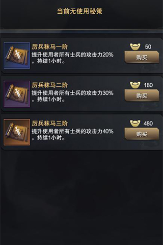 厉兵秣马和步步为营秘策将分别提升我方所有士兵的攻击力和防御力;