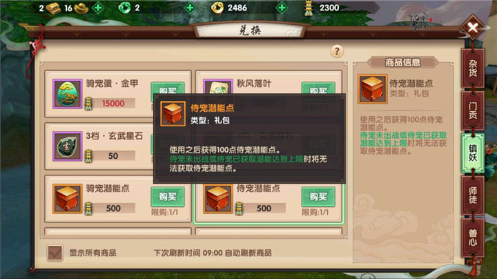 另外我们也可以通过兑换系统中的镇妖商店来兑换,在镇妖塔商店中选择侍宠或者骑宠潜能点,就可以用500声望换取100点宠物潜能值,但是需要注意的是,宠物必须得在出战状态并且获取潜能值没能达到上限才可以哦,仙友们快去兑换吧,让宠物学会更多技能,我们才会变得更强大。