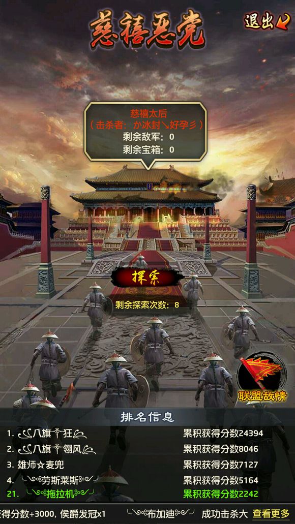 铲除妖后副本就是蒙古兵+葛尔丹的组合体 大小太监等等就是不同波数的蒙古兵 慈禧就是葛尔丹 慈禧血量800亿 可能会因区而异 玩法和平时一样 多探索 自动分享出来 大小太监等小Boss多得打不过来 大Boss打不死