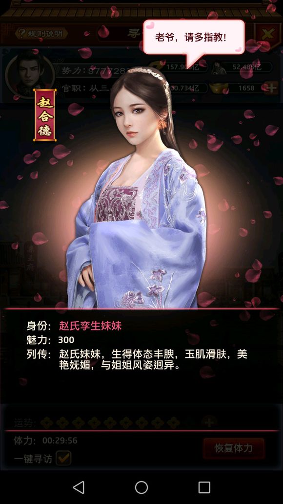 体力全满可以寻访3次,体力全部用完要等29分50秒,而且寻访过程中遇到其他人的机率比遇到红颜的机率大。