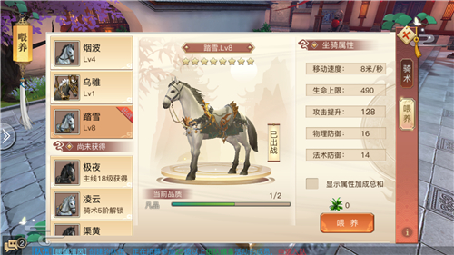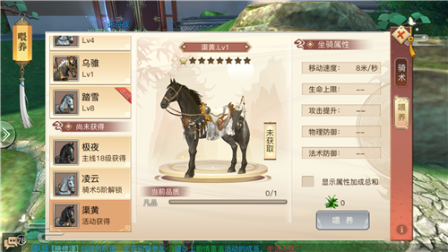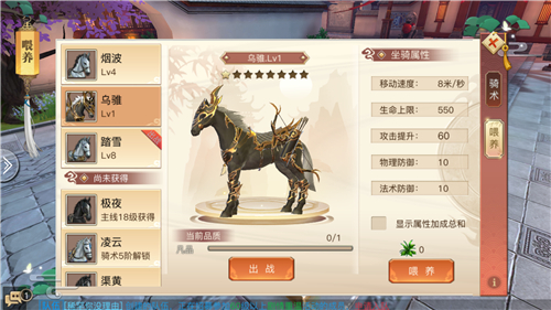 乌骓性格酷烈桀骜,后遇西楚霸王项羽,为项羽的拔山之力所驯服,后与霸王一起建立功勋无数,乃是当时天下第一的骏马,尝日行千里不疲,世间同样独此一匹。因脚程原因屈居渠黄之后,位列第二。在游戏中,乌骓同样能够为玩家提供大量属性加成,虽然品质屈居第二,但在外观上却显得更为神骏,同样是不可多得的良驹。