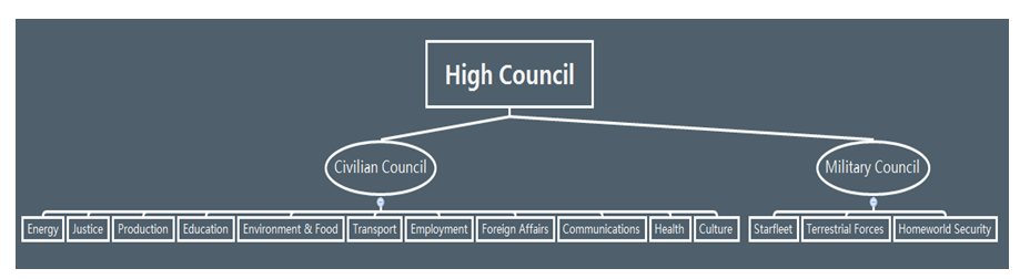人类的最权威机构是最高议会。最高议会是一个5人技术专家治国议会,由5个人类地缘组织每个选举一位代表。尽管地球上的生活还在继续,人类有着自己的管理体系,因为大多数人类已经前往太空。