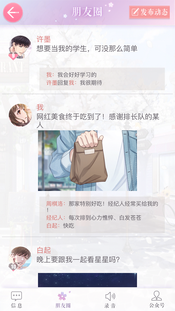 除了发信息之外,手机系统还有一个朋友圈的功能。朋友圈的内容同样是根据主线和约会剧情进展触发的。